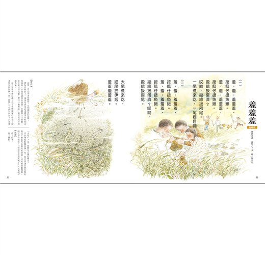 本書收錄了17首描寫台灣早期生活景物和孩子趣事的台語兒歌,由台灣重要文史專家莊永明、兒童文學作家林武憲與李紫蓉共同執筆賞析;以及國寶級兒童插畫家曹俊彥和劉伯樂、徐素霞、張哲銘等傑出創作者筆下趣味生動的繪圖,帶孩子一探歌曲中台灣古早的風俗民情!