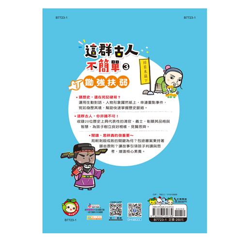 【讀歷史,還在死記硬背?】 運用生動對話,人物形象躍然紙上,串連重點事件,宛如身歷其境,幫助快速掌握歷史脈絡。 【這群古人,你非識不可!】 收錄20位歷史上具代表性的清官、義士,彰顯其品格與智慧,為孩子樹立良好榜樣,見賢思齊。 【閱讀、思辨真的很重要~】 荊軻刺殺成敗的關鍵為何?包拯審案秉持著哪些原則?讓故事引領孩子判讀與思考,增進核心素養。