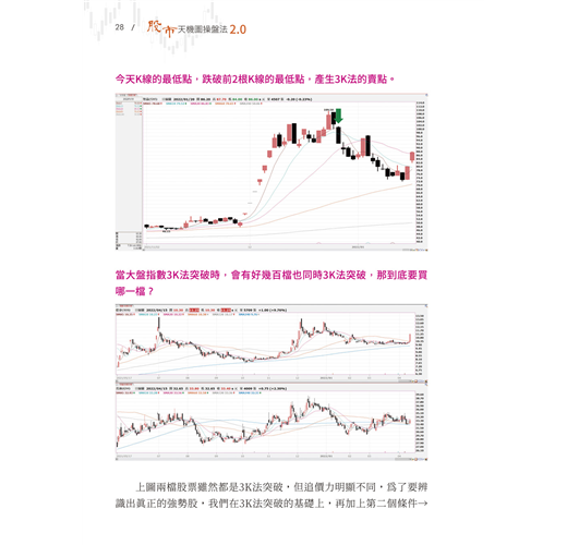 3K法的日線操作是短線轉折買賣點,主要目的在降低成本,重點在執行日線3K法跌破賣出,在移動平均線MA10或MA20月線買回,進行大波段操作,在週線3K法尙未跌破之前,都要持有,這才是長線抱牢的單股操作,當然這是針對職業投資人而言,如果你自認沒時間管理股票,那麼在持股脫離成本後,你也可以直接以週線3K法操作,不予理會日線的震盪,操作的方法沒有絕對,找到讓自己最舒服的操作方