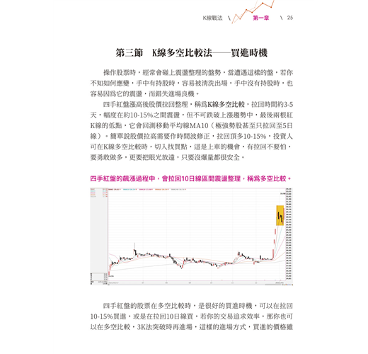 四手紅盤的股票在多空比較時,是很好的買進時機,可以在拉回10-15%買進,或是在拉回10日線買,若你的交易追求效率,那你也可以在多空比較,3K法突破時再進場,這樣的進場方式,買進的價格雖然較高,但是時間成本卻最小,選擇哪一種進場方式,就看自己的立場了。