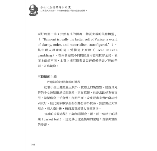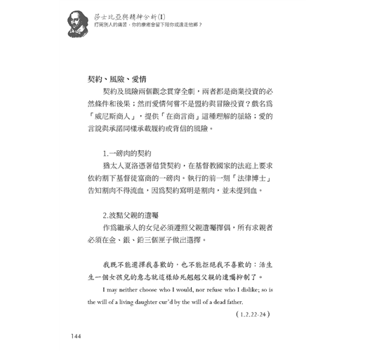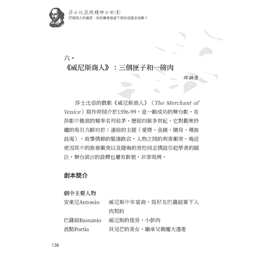以上內容節錄自《莎士比亞與精神分析(I):打開別人的痛苦,你的療癒會留下陪你或遠走他鄉?》邱錦榮、王明智、陳瑞君、陳建佑、王盈彬、吳念儒、劉玉文、劉又銘、蔡榮裕 合著.薩所羅蘭出版