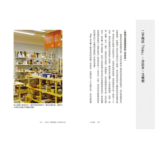 二手商店是實踐「循環經濟」(circular economy)的場域。人類從工業革命至今,主要採用分為「開採(take)-製造(make)-丟棄(dispose)」三階段的線性經濟(linear economy)。線性經濟之下,資源被開採、製成物品後,一旦盡其用,就會被丟棄,導致資源無法循環。也就是說,物品被消費者丟棄後,壽命就結束了。另一方面,線性經濟若要長期運作,必須持續投入便宜的資源。然而,隨著原物料價格的變動和暴增,以及資源枯竭的徵兆愈來愈明顯,其可行性正在動搖。據估計,至二○三○年為止,全球將新增三十億中產階級人士。屆時人類能否繼續維持單向且消耗性的線性經濟,是個問題。顧名思義,「循環經濟」就是連接「線性經濟」的線頭兩端,形成一個可循環的圓形經濟結構,使原本在線性經濟之下壽命就終結的物品能夠透過維修、再利用或再生等過程,再次被使用。