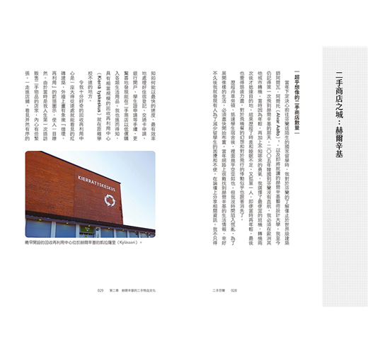 令我十分好奇的回收再利用中心是一座大得從遠處就能看見的紅磚建築,外牆上畫有象徵「循環、再利用」的箭頭圖示,使人一目了然。由於當時是我人生第一次造訪販售二手物品的店家,內心有些緊張。一走進店鋪,看見井然有序的空間和饒富趣味的物品,我就放鬆了下來並開始到處探索。回收再利用中心陳列了各式各樣的物品,分門別類整理得很好。一樓陳列體積較小的廚房用品、書籍、服飾、家電等,二樓則陳列體積較大的家具並設有家具維修站。那一天,我立刻買了書桌、椅子、茶几、燈具等急需使用的家具,在店員親切的幫助下將家具全都送上卡車,坐上副駕駛座,直接回到了我那空蕩蕩的宿舍。從那天起,我開始在往返學校的路上發現一間又一間二手商店。不久後更發現,赫爾辛基市區的二手商店數量超乎我的想像。