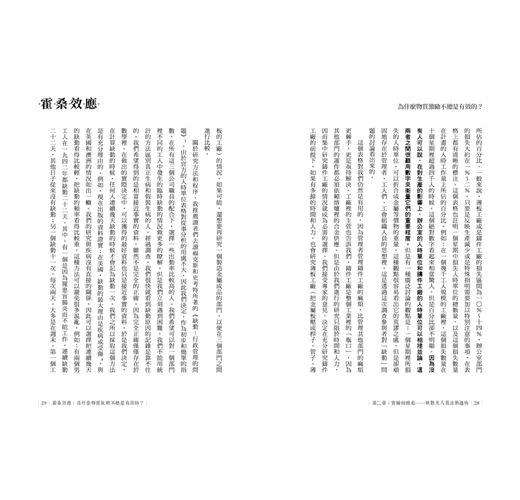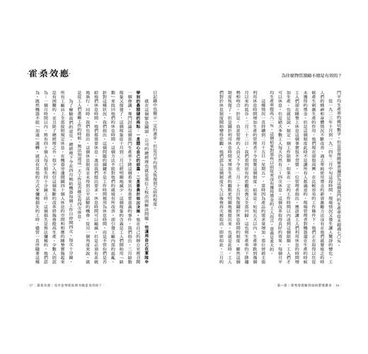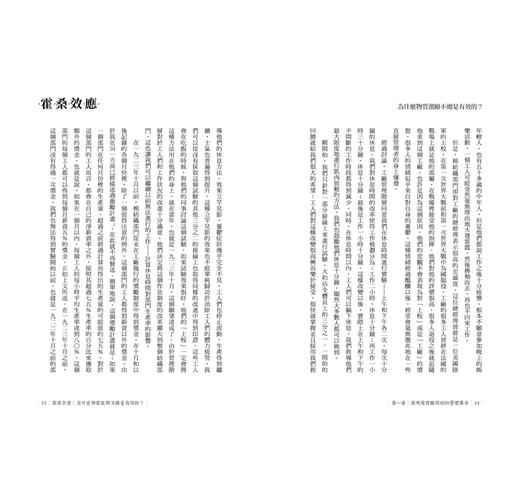 剛開始,我們只針對一部分接線工來進行試驗,大約佔全體員工的三分之一。一開始的回饋就給我們很大的希望:工人們對這種改變很高興而樂於接受,很快就掌握並且採用我們教導他們的休息方法。效果立竿見影,憂鬱症狀幾乎完全不見,工人們也停止流動,生產得到繼續,士氣也普遍得到提升。這種立竿見影的效果也不能單純歸功於消除工人們的體力疲勞,我們可以從沒有採取這個試驗的其他三分之二的接線工也取得同樣的改進中得到印證。這些工人會在吃飯的時候,與他們的同事討論這個試驗,如果試驗效果很好,他們的「上校」一定會將這種方法用在他們的身上。就在當年,也就是一九二三年十月,這個願望達成了,由於管理階層對於工人們和工作狀況的改進十分滿意,他們決定將這個作息制度的改革擴大到整個紡織部門。這也讓我們可以繼續以前無法進行的工作——計算休息時間對部門生產率的影響。
