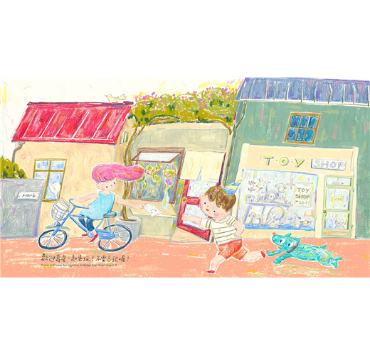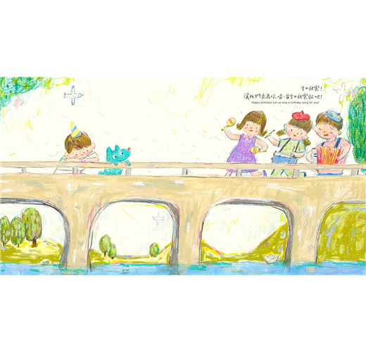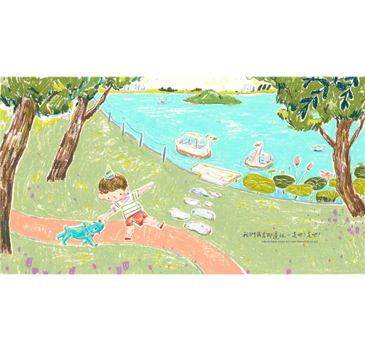 以色鉛、油蠟筆獨特的質地混搭,畫出故事底蘊想傳遞的純真與溫暖。