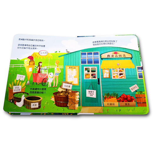 除了一窺農場的面貌,你也能踏進農場的商店,看看有賣哪些食物、生活用品,而你知道像是麵包是用什麼農作物做成、起司是用什麼製作而成的呢?在看完了這本關於農場的翻翻書,你可以去試著當個小小農夫、也能去農場體驗看看這些美好的景色喔!