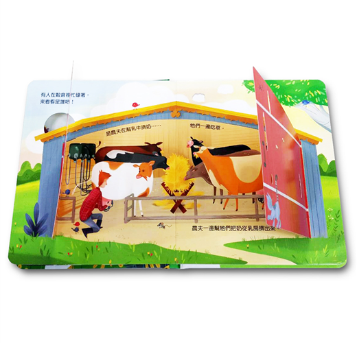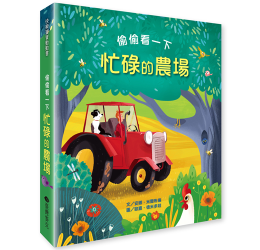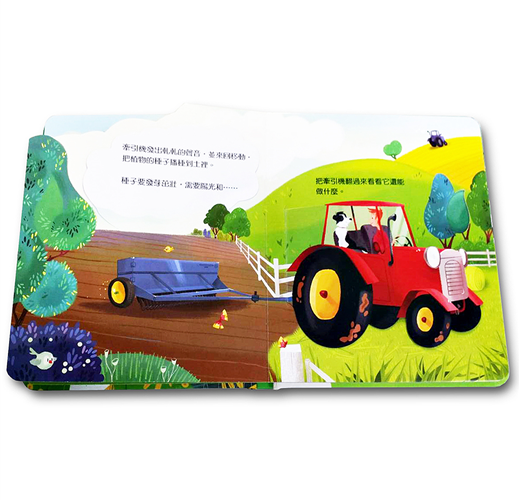 從封面開始,一輛拖曳機載著一位男孩和小狗,行駛在森林步道中,而有一隻公雞正在樹叢中偷看著他們。在這樣一個有別於都市景觀的畫面當中,我們將被帶領進入充滿著大自然氣息的農場!