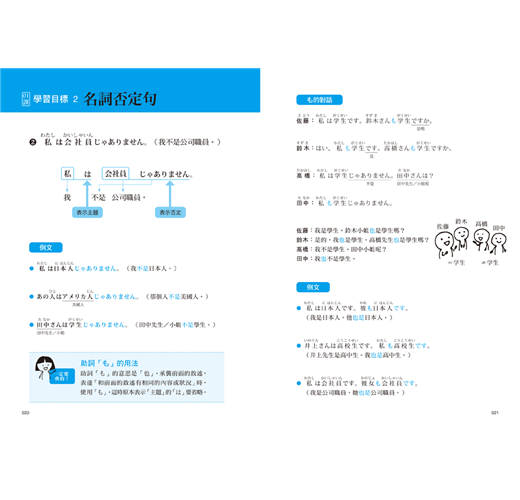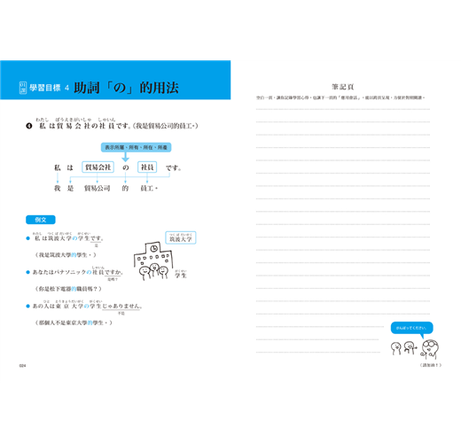 ●[練習題本]:以「8大類助詞」為中心,規劃「全句式」日語練習題。將中文想法結合提示的助詞,從實際運用中複習,熟練這個時候該用哪一個文型、助詞,有助提升日語活用能力。
