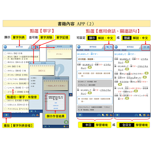 【書籍內容 APP】:包含「雙書裝、MP3音檔」,並增加紙本書沒有的 ── 各課單字測驗題!
