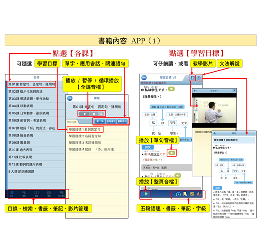 ●[點選各課後]:可隨選「學習目標、單字、應用會話、關連語句」