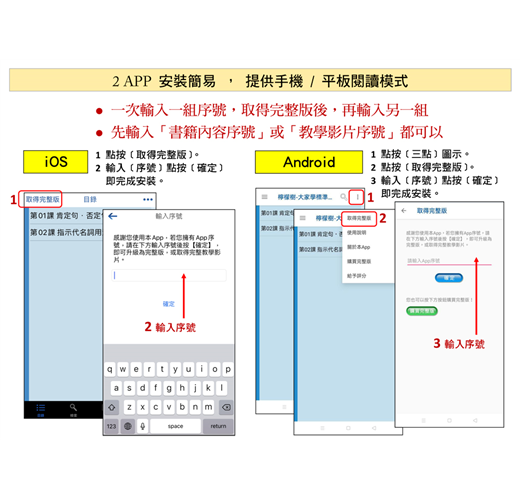 1. 取出隨書附的「APP啟用說明」:內含2組安裝序號(書籍內容1組+教學影片1組)