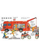 《災難救援車大集合》讓小朋友從車頭、車尾和側面來觀察救援車輛如何運作,