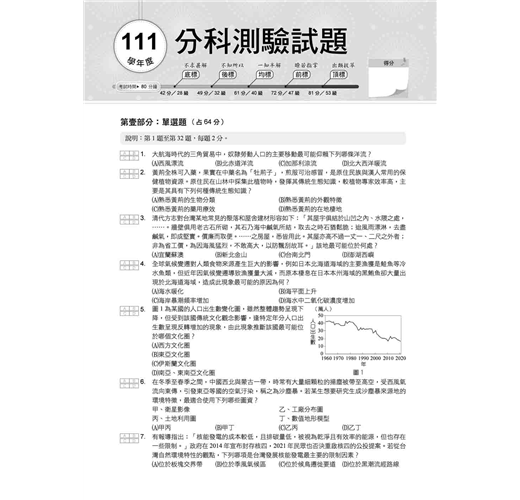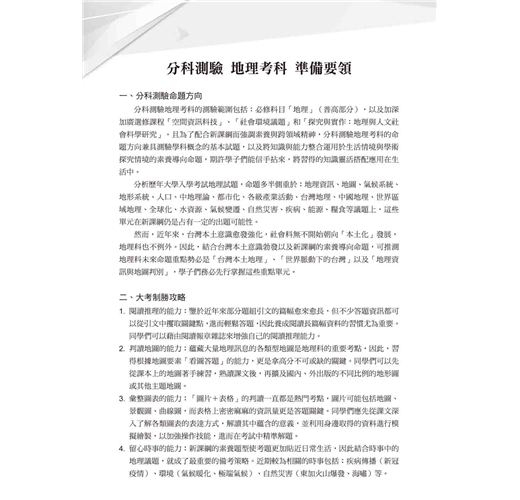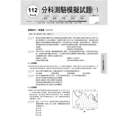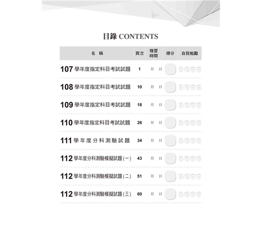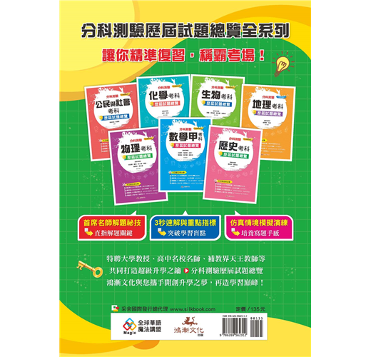 本系列套書規劃之「重點指標」標明各考題出處,將菁華提煉出來,幫助您突破學習盲點,輕鬆複習解題要點,並將「超綱」題目篩出用「*」標記;而「3秒速解」教您快速破題,提高答題效率,讓學習不再只是單一思路。此外,本系列採用答案欄及填答畫格的設計,每個年度清楚標示考試時間及分數落點,讓您掌握作答時間、檢測自我實力,營造擬真的作答情境,提升考生們應試的即戰力!全書一開始提供各考科的考試方向與準備要領,以及複習時間與自我勉勵狀況的紀錄,利於同學們安排進度、抓住重點複習,奠定勝利的基石!為了幫助同學們熟悉分科測驗的命題方式,特聘補教權威名師針對最新命題趨勢、網羅各類題庫,輔以Learning Analytics統計,編寫3回模擬試題讓學子們實戰演練,並輔以擬真的卷卡合一答案卷拉頁,提前熟悉應試作答的技巧,掌握得分關鍵,馳騁考場、傲視群雄!