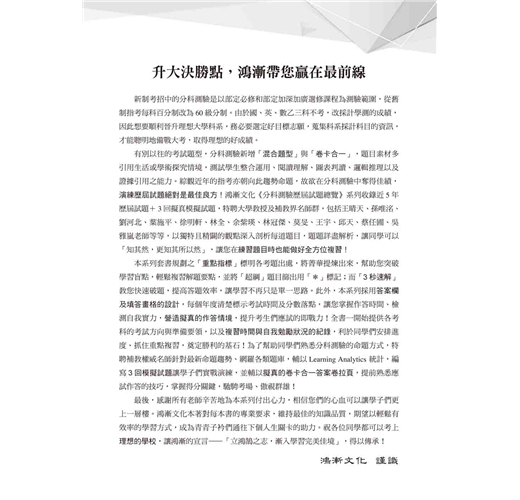 最後,感謝所有老師辛苦地為本系列付出心力,相信您們的心血可以讓學子們更上一層樓。鴻漸文化本著對每本書的專業要求,維持最佳的知識品質,期望以輕鬆有效率的學習方式,成為青青子衿們通往下個人生關卡的助力。祝各位同學都可以考上理想的學校,讓鴻漸的宣言—「立鴻鵠之志,漸入學習完美佳境」,得以傳承!