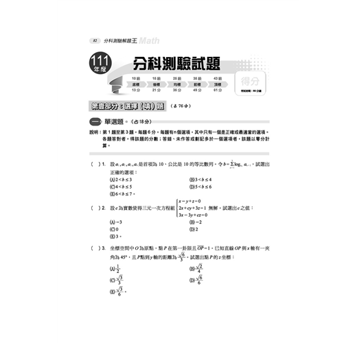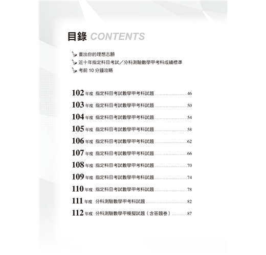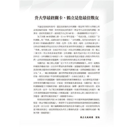 分科測驗取代了原來的指考,由原本的十科縮減成七科,目的在檢視同學是否具有大學校系所要求的學科的深廣能力。且在採計科目上,各校系會從學測、分科測驗、術科考試中取3至5科作為採計科目,分科測驗至少採計1科,想依循「考試分發」進入理想大學的話,分科測驗的準備必然不能鬆懈。有鑑於此,本系列收錄近10年歷屆試題,除了鑑往知來,還提供同學最充分的演練題庫,相信在經過10年份的歷屆試題洗禮下,自身實力能更上一層。