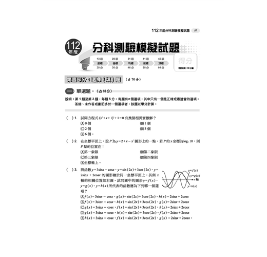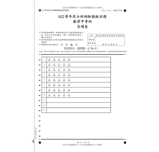 112年度分科測驗數學甲考科模擬試題(含答題卷)