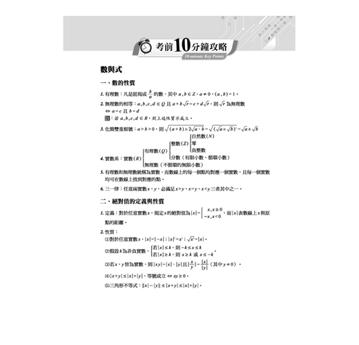 收錄考前10分鐘攻略,依據近十年出題率及最新課綱強弱化程度,將大考測驗範圍內的必考觀念重點編入,期望學子在最短時間內能掌握重要基礎概念及定理。