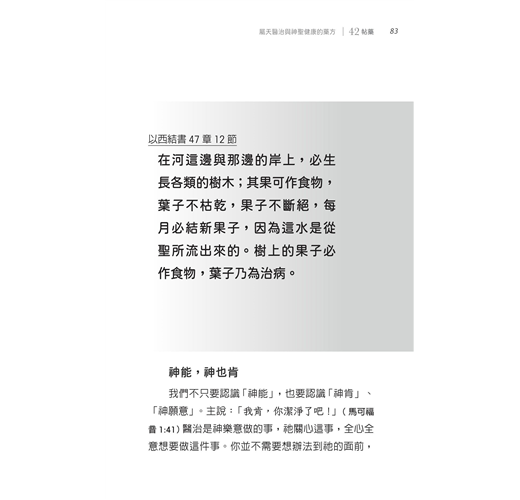 本書這些聖經經文,就是在幫助大家,藉著讀、默想、祈禱,讓神生命的種子栽於我們全人全身中,帶來屬天醫治與神聖健康。這些經文不只是藥帖,也是健康食品。