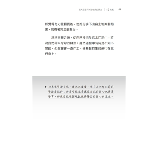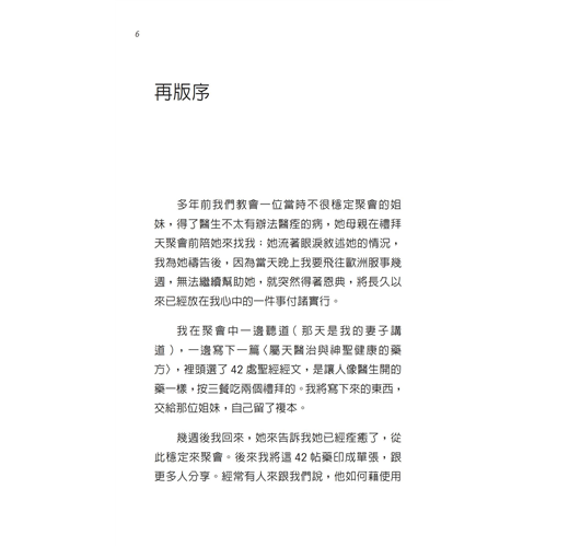 幾週後我回來,她來告訴我她已經痊癒了,從此穩定來聚會。後來我將這42帖藥印成單張,跟更多人分享。經常有人來跟我們說,他如何藉使用這份單張得著醫治或祝福;有一次一位朋友告訴我,他到美國加州出差時,遇見一位年長姐妹向他作見證,如何藉著一份〈屬天醫治與神聖健康的藥方〉得著神奇妙的醫治,然後說:「我不知道那是從哪裡來的。」我很高興我那朋友也沒跟她說是誰編寫的,因為讓人得幫助的正是神的話語。台北以琳出版社曾幫我們出版《屬天醫治與神聖健康》一書,裡頭有更詳細的信息與教導,我們也將這42帖藥錄在該書裡面。