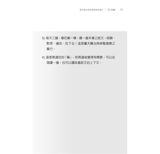 4) 這是兩週份的「藥」,若兩週後覺得有需要,可以從頭讀一遍,也可以讀該處經文的上下文。
