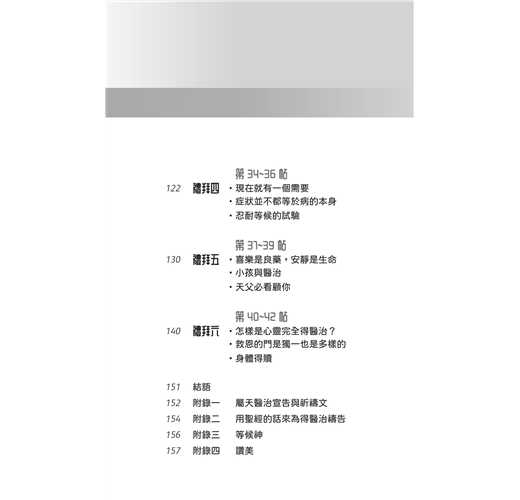 我們又從士林錫安堂出版的《用聖經的話來禱告》一書中,摘出為得醫治禱告的那一段,放在附錄二。附錄三〈等候神〉與附錄四〈讚美〉,則是初版已經放進去的兩篇短文,是幫助人追求主的精練文字;我們有生命的追求,對得著醫治有很大幫助。