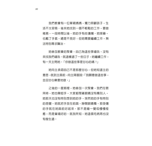 我們教會有一位單親媽媽,獨力照顧孩子,生活不太容易。後來她找到一個不輕鬆的工作,要做雜務,一段時間以後,她的手有些潰爛。她搽藥,也戴了手套,總是不見好;但她需要繼續工作,無法特別尋求醫治。