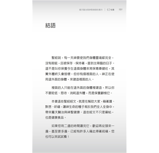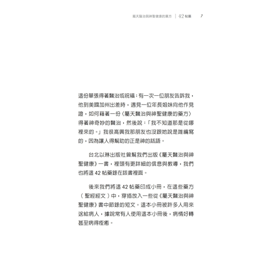 先前初版的小冊,我們曾在後面附了幾年前我寫給有需要之人的〈屬天醫治宣告與祈禱文〉,附有使用說明,可以配合著這42帖藥來使用。在這本再版的書裡,我們保留它成為附錄一。
