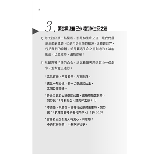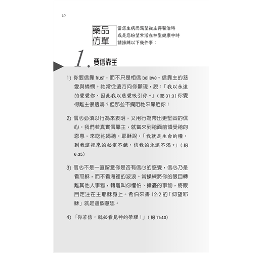 3) 每天三餐,像吃藥一樣,讀一處本書之經文,咀嚼、默想、禱告、吃下去!這是屬天醫治與神聖健康之藥方。