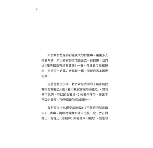 如今我們想經銷到更廣大的對象中,讓更多人得著幫助,所以將它製作成更正式一些的書;我們從《屬天醫治與神聖健康》一書,多摘錄了幾篇短文,使得每一帖藥之後都有一篇,印製成這本再版的書。