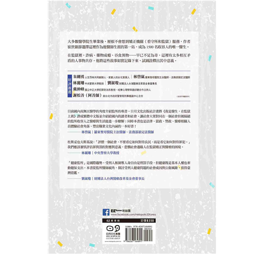 目前國內尚無以醫學的角度介紹監所的專書。日月文化出版社計畫將《我是醫生,在監獄上班》譯成繁體中文版並介紹給國內的讀者和社會。讓社會大眾對同在一個社會但被隔絕的監所收容人之醫療與生活能進一步瞭解;同時本書也是法律、獄政、警政、醫療相關人員體驗社會角落、豐富職業文化內涵的一本好書!──林啓嵐|羅東聖母醫院主治醫師、法務部頒定法醫師