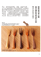 附錄木材特性簡介.木材一覽表.木工道具使用技巧手感溫潤的木湯匙、輕巧可愛的奶油刀等,本書介紹了各式各樣由木工作家製作而成的木餐具以及器皿、盒子等。在此先來定義所謂的「木製餐具」這個詞彙吧!