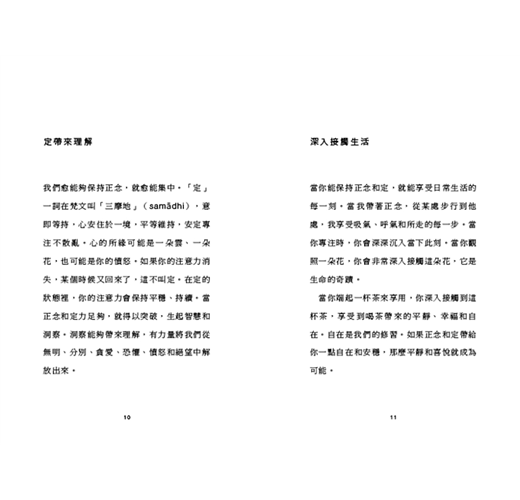 一行禪師的方法非常直觀,從聆聽、感受下手,講的是一般人都能體會、理解的方法。尤其是被忙碌生活節奏帶著走的都市人,更能在一切回歸簡單的過程中,找到自己,碰觸生命的肌理,實實在在感受生活的喜悅。