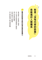 那你一定要看這本書。透過談吐、措辭、說話方式、講話時機、話題選擇等技巧,你會比現在更有趣,跟任何人說話都融洽,讓人感覺跟你在一起很開心。