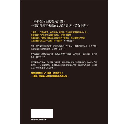 .以書店與殺人為題材讓我很有興趣,也很好奇為何柳教授要拖著不方便的身體等待十五年……能夠看到這樣一本讓人感到非常暢快的小說,真的很開心。