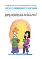 伊萊莎牧師娘是台灣基督長老教會第一位牧師李庥的夫人,也是台灣第一位女宣教師,更是台灣第一所女子中學的創辦人,倡導解放纏足,成為台灣女權運動的先鋒。