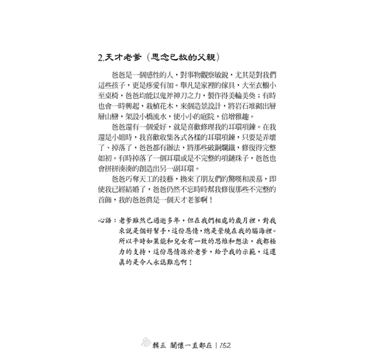 爸爸是一個感性的人,對事物觀察敏銳,尤其是對我們這些孩子,更是疼愛有加。舉凡是家裡的傢具,大至衣櫥小至桌椅,爸爸均能以鬼斧神刀之力,製作得美輪美奐;有時也會一時興起,栽植花木,來個造景設計,將岩石堆砌出層層山巒,架設小橋流水,使小小的庭院,倍增雅趣。