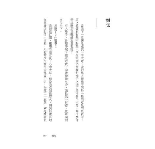 正當我想在空白處用紅墨水寫上「沒有意義的一概而論!」時,我遲疑了。小心!我好像最近在哪聽過這個有黑鬼兩個字的句子?到底在哪?對了!這個句子在餐廳的廣播器裡滔滔溢出,讓我幾乎倒盡胃口。(......)
