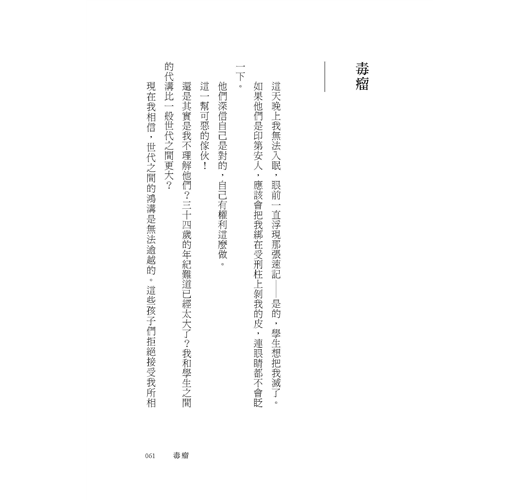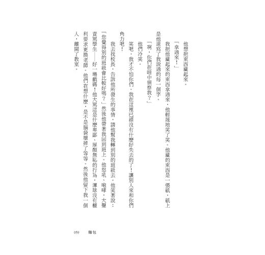 別傻了,我克制著自己不要多想。你捧著有退休金的鐵飯碗,而且今天還是這種沒有人知道明天地球是不是還在轉動的時代。有多少人會快意地翹起二郎腿,什麼都不在乎了,如果他們有你這樣的職位?候選教師之中,真正能夠以教師為業的比例是多麼的少!趕快感謝上帝吧,你現在隸屬於一家市立中學,是專任教師了,也就是說你經濟無憂,變笨變老都不會有人干涉!你可以活到一百歲,也許還會成為祖國最長壽的國民!你生日的時候,雜誌會刊登你的照片,標題會寫著:「他的精神依然健碩」,而且這一切都有退休金可以拿!好好想清楚,別犯錯而毀了這一切!