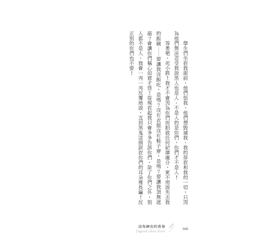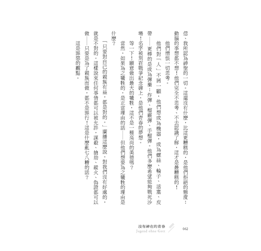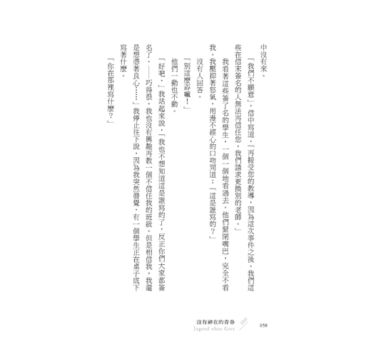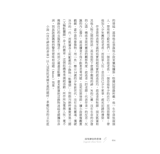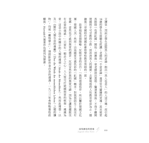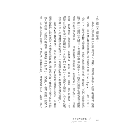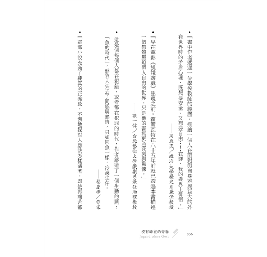 這本《沒有神在的青春》被多次改編為各式作品上演,為享譽國際最重要的代表作,也是電影《未來生存遊戲》原著小說,被稱為德國版《飢餓遊戲》。作品刻畫納粹當道的時代背景,藉青春校園故事描述獨裁統治群眾的瘋狂,至今仍可為鑑。