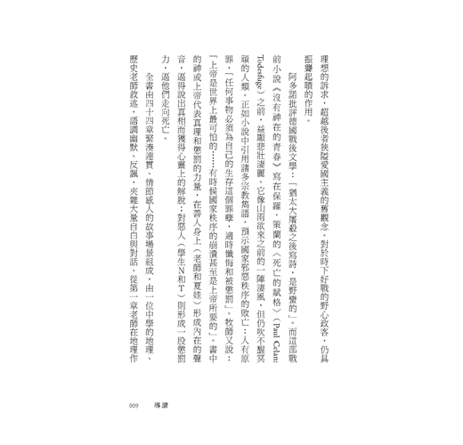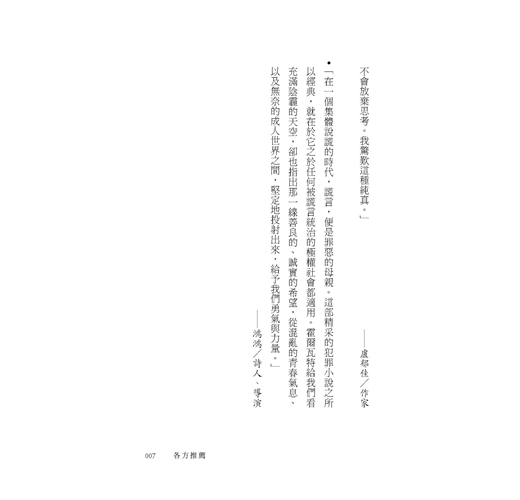「這部小說充滿了純真的正義感,不懈地探討人應該怎樣活著,即使再痛苦都不會放棄思考。我驚歎這種純真。」──盧郁佳