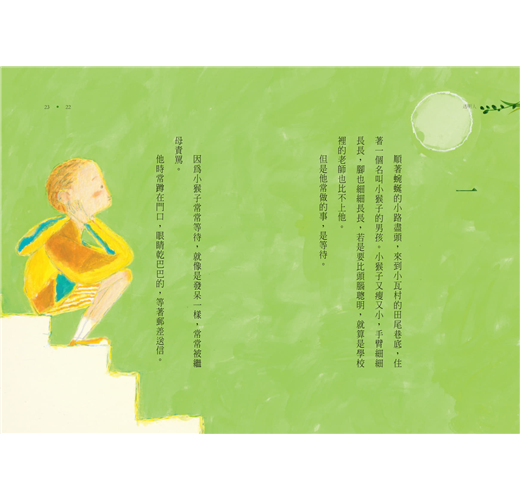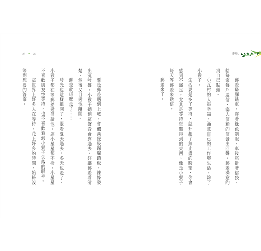太陽亮得像剛孵出來的,圓圓潤潤,亮亮晶晶,照得小瓦村好明亮,物體後頭的每道影子好美。小猴子看著自己手臂上的寒毛,影子好細,隨著太陽而慢慢移動。他忽然站起來眺望,郵差從路的另一端來了。郵差騎腳踏車,穿著綠色制服,車後座掛著信袋,給每家每戶送信,塞入信箱的信發出回聲,郵差滿意的為自己點頭。