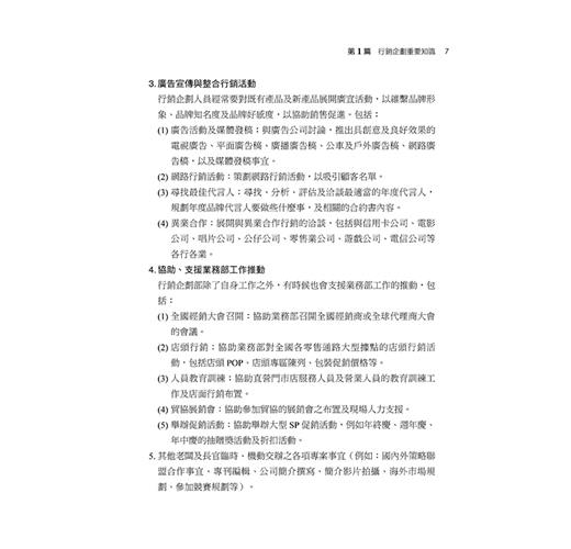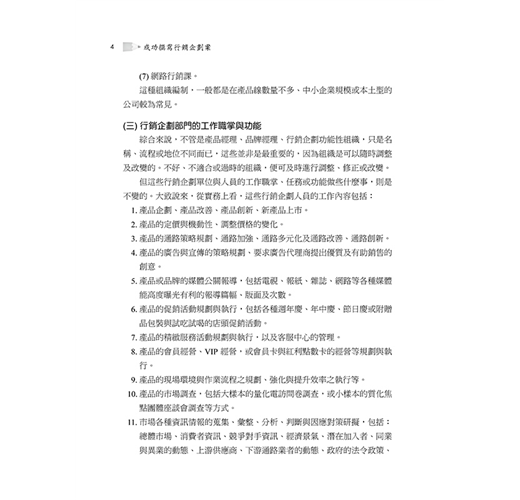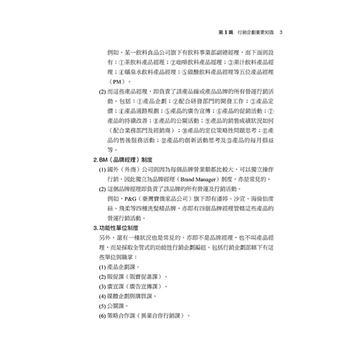 2. 而這些產品經理,即負責了該產品線或產品品牌的所有行銷活動。包括:(1) 產品企劃;(2) 配合研發部門的開發工作;(3) 產品定價;(4) 產品通路規劃;(5) 產品的廣告宣傳;(6) 產品的促銷活動;(7) 產品的持續改善;(8) 產品的公關活動;(9) 產品的銷售成績狀況如何(配合業務部門及經銷商);(10) 產品的定位策略性問題思考;(11) 產品的售後服務活動;(12) 產品的創新活動思考等。