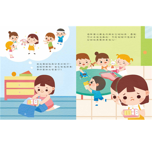 瑞瑞的媽媽和老師用同理心且正面的鼓勵,回應瑞瑞不願意分享的心情,更藉由漸進式的引導,幫助瑞瑞學會並體驗分享帶來的快樂。