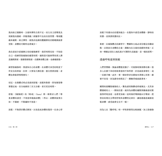 陰瑜伽與靜心,是對營營役役的都市人的福音,練習的過程給心騰出空間,去聆聽與感受身體與內心,並透過呼吸法感受當下即平靜的狀態。本書集合陰瑜伽、解剖學、中醫等理論與實踐的內容,帶領人們了解內在因素與外在環境的相互作用,進而明瞭大宇宙與小宇宙相應與合一之重要性,既是瑜伽入門書籍,也是資深瑜伽修行者隨手翻閱就可在心靈上收穫滿滿的精神食糧。