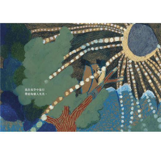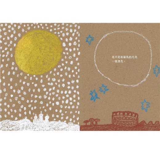 阿雷馬娜以稚拙、純真的蠟筆作畫,她誠懇且篤定的線條,和諧及穩定的用色,童趣而美麗的圖畫,恰恰與羅大里充滿希望、力量且饒富詩意的文字相得益彰,他們聯手將月亮散發出的無私光芒帶到我們面前,讓我們看見美麗的月光。每到黑夜,萬物都睡著了,世界只剩下月亮,翻開繪本,月亮忽遠忽近,月亮就在我們身旁,我們彷彿聽見月亮在對我們歌唱,月亮在對我們說悄悄話:我每晚旅行,給每個人我的光⋯⋯