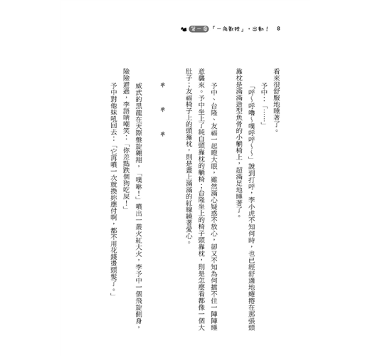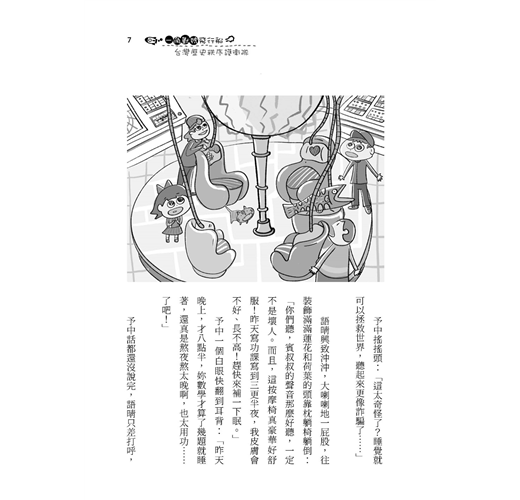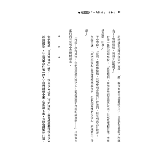 那不是日月潭神話裡的黑龍和白龍嗎?脾氣暴躁的黑龍和淘氣的白龍逃家了,在台灣各地邊玩邊搞破壞,搗亂一段段的線性歷史,「台灣歷史秩序護衛隊」的隊員:予中、予晴、台隆、友福、小虎,搭乘由台灣神明們主持、護佑這塊土地的「一角獸號」飛行船,一路窮追狂打跟著黑龍、白龍,收服錯誤和混亂,努力完成每一項任務,讓線性歷史回復正軌……