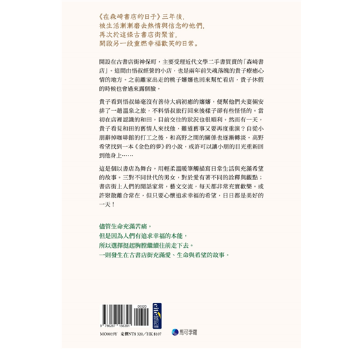 開設在古書店街神保町,主要受理近代文學二手書買賣的「森崎書店」。這間由悟叔經營的小店,也是兩年前失魂落魄的貴子療癒心情的地方。之前離家出走的桃子嬸嬸也回來幫忙看店,貴子休假的時候也會過來露個臉。