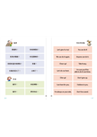 語言必須經常使用,本書所附的短句卡是由生活中常用的英文句子組成,分成孩子常用句、媽媽常用句,而且更包含谷稱讚、同意、勇氣、鼓勵、培養好習慣,以及表現親愛的好用句子,可貼在桌子、冰箱、浴室或是牆壁等地方,或是一張張剪下來使用也可以,只要常看就會有記憶。