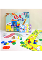 遊戲底紙1張、顏色片12個、棋子4個、點數骰子1顆、蒐集卡5張、障礙卡4張、玩具卡25張。