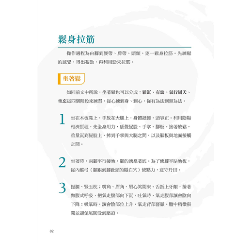 練習禪勁太極養生時,心要先靜下來,覺知身體在哪,心就在哪的動中禪,是同時訓練認知、知覺和運動的養生法。養生在於延展筋脈,使得全身的經絡通暢。筋膜鬆開,骨和骨之間、器官與器官之間都鬆開,身體如水一般柔和,也就是「流水不腐」。水漾人生自然就能擁有花漾年華,是從內而外的最佳保養方法。本書是以鄭曼青大師的《鄭子太極拳自修新法》為最高指引,「吞天之氣,接地之力,壽人以柔」為最高目標。